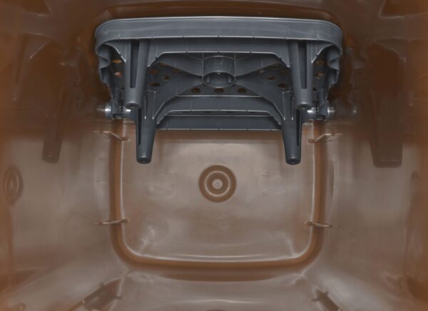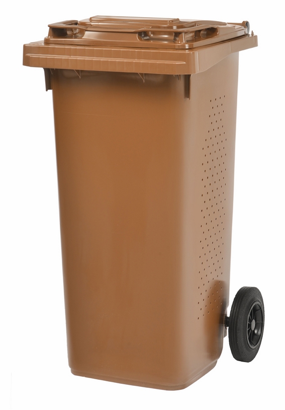 The brown bio-waste container 120 L is made of low-pressure high-density polyethylene (HDPE), ensuring exceptional resistance to damage and external factors including prolonged UV exposure, subzero temperatures, and heavy rain. It features a reinforced bottom to withstand heavy loads. Pigments used are free of harmful compounds such as cadmium and lead.