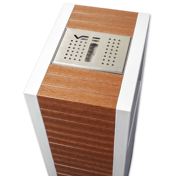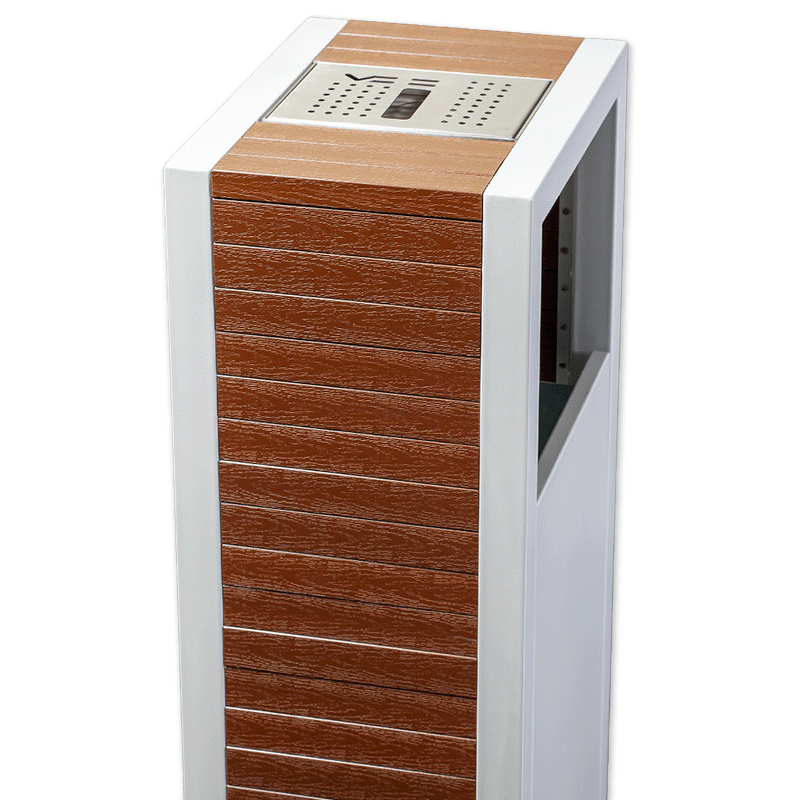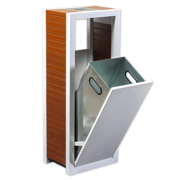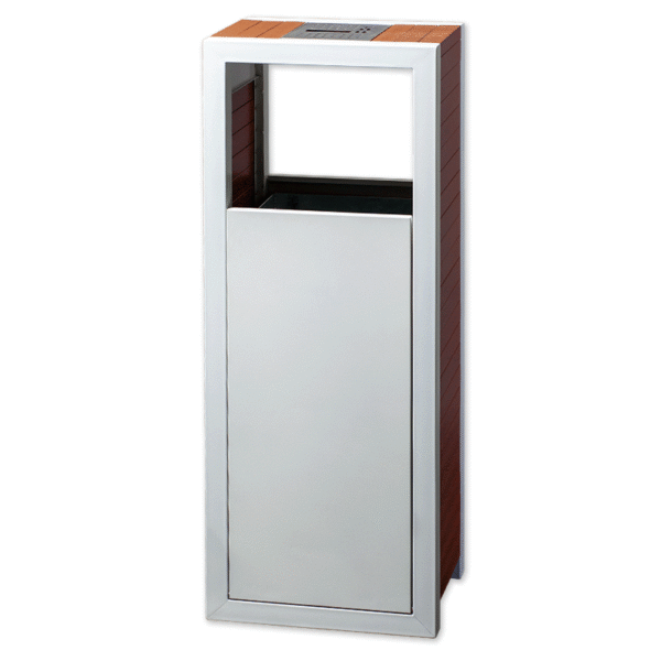 This bin features a stainless steel-colored construction with decorative composite wood (WPC) slats. Materials used:
