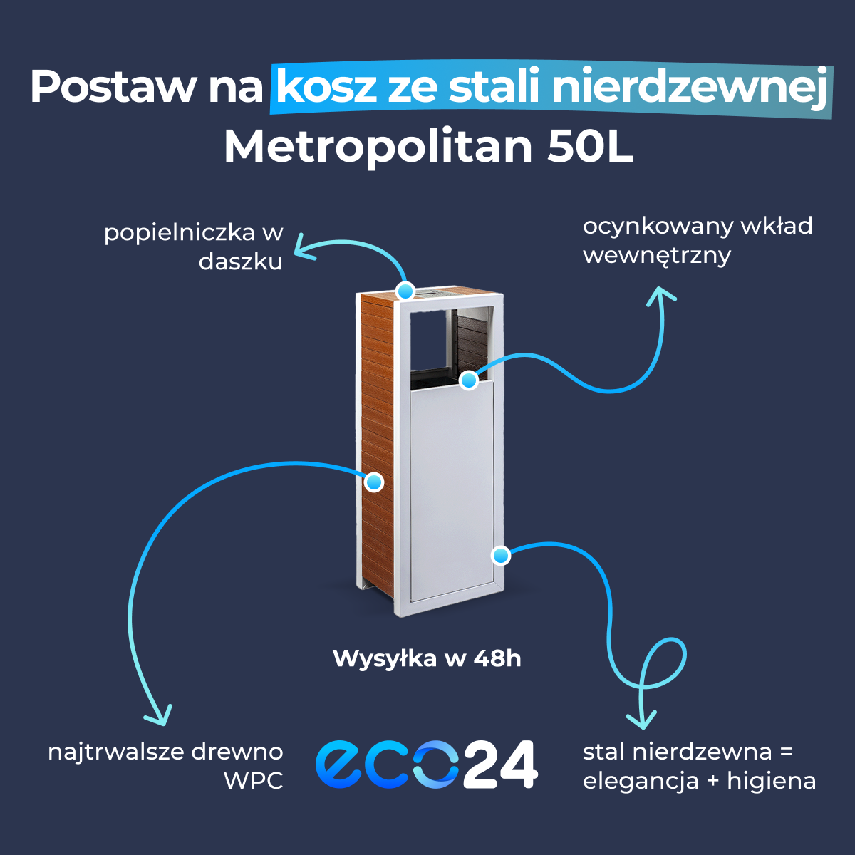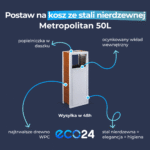 The Metropolitan 50 L stainless steel street bin is an exceptionally functional and aesthetic solution for outdoor spaces. With a built-in ashtray, it is ideal for high pedestrian traffic areas such as sidewalks, town squares, bus stops, and near shopping centers. It also blends harmoniously into recreational spaces like parks, gardens, squares, and walking paths, and is suitable for residential estates, hotel courtyards, sports facilities, and gas stations.