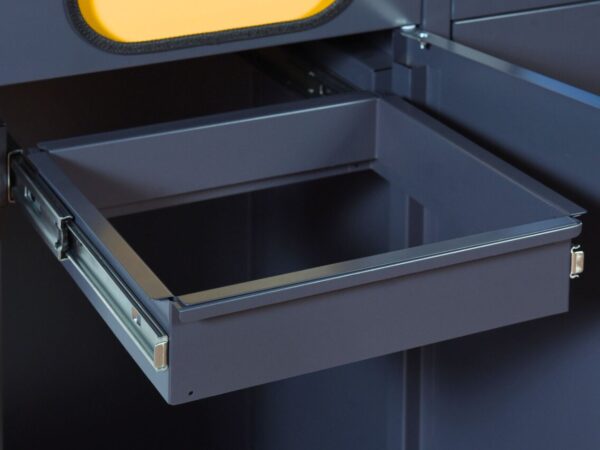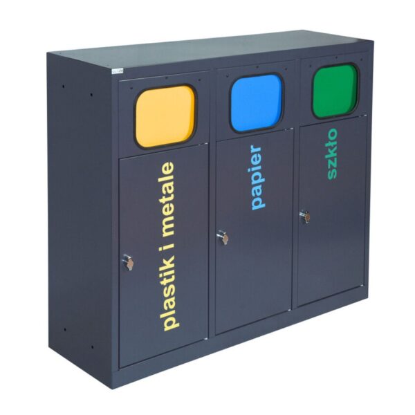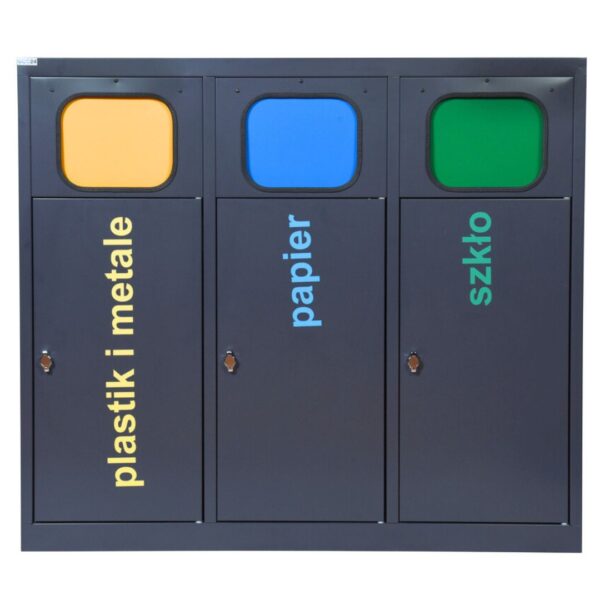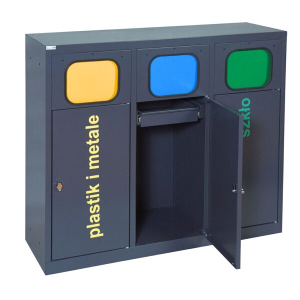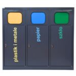 The 3-compartment steel recycling bin is designed for indoor use. It is made of high-quality painted steel, which provides an attractive appearance and resistance to mechanical damage. The indoor recycling container therefore resists accidental knocks common in heavily used spaces and will retain good technical condition for years of use.