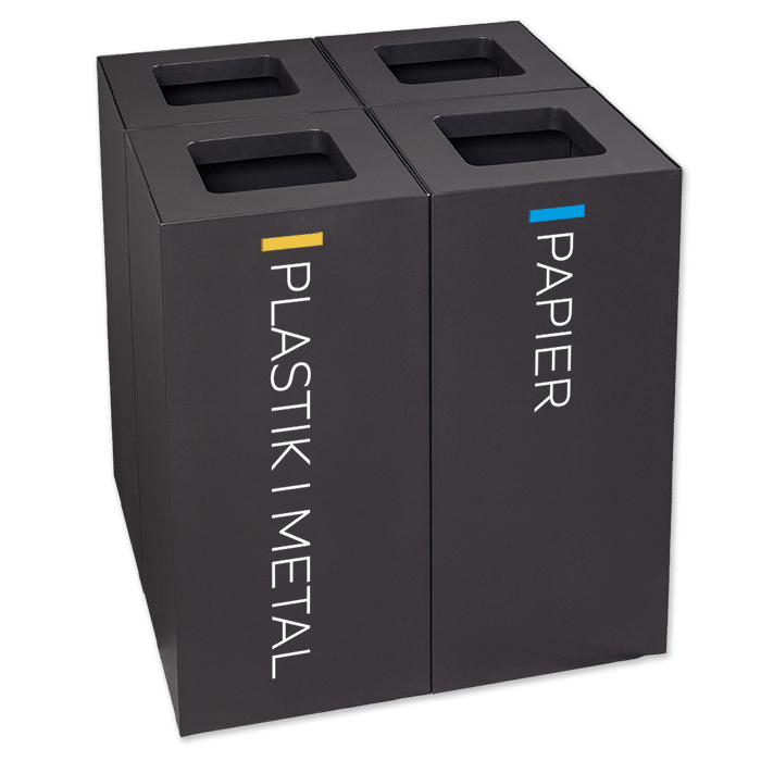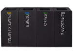 Recycling 4-chamber waste container — ideal for cities, parking lots and green areas. The modular eco 4 x 50 L black bin enables easy implementation of selective waste collection in any outdoor space.