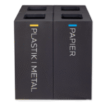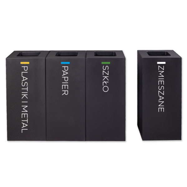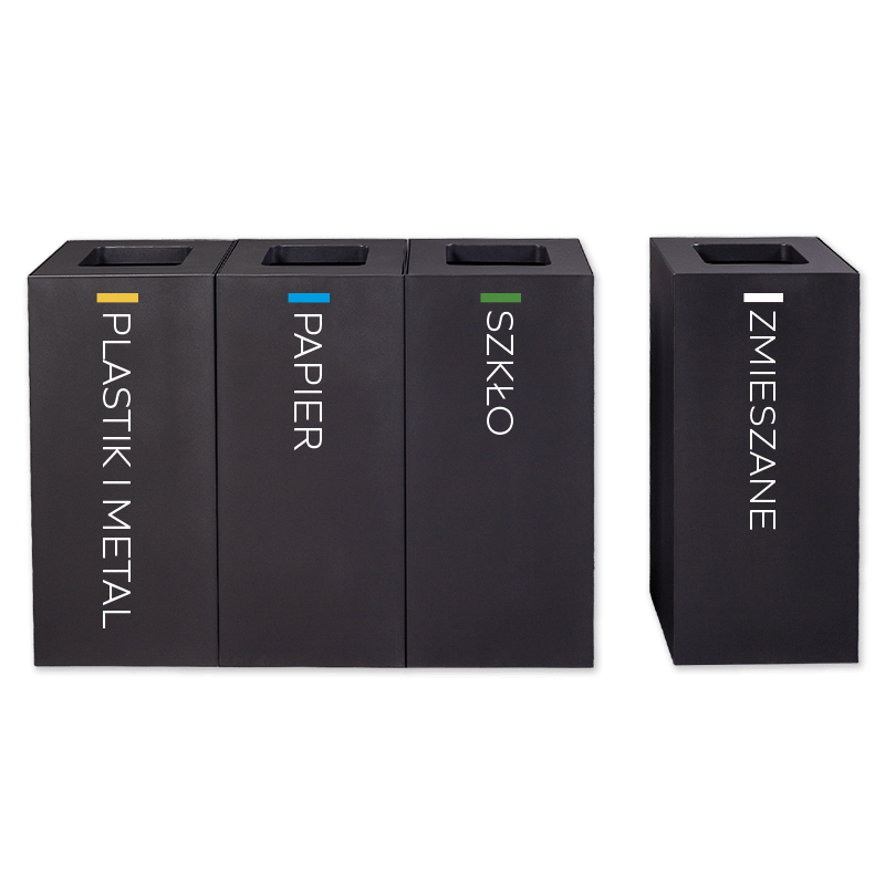 The eco modular 4 x 50 L black recycling bin provides an easy solution for basic selective waste collection in outdoor spaces. With high-quality workmanship and a minimalist design, this 4-chamber container suits public places such as office complexes, government buildings, schools, hospitals, parks, squares, playgrounds, sports fields, swimming pools, parking lots, and residential estates.