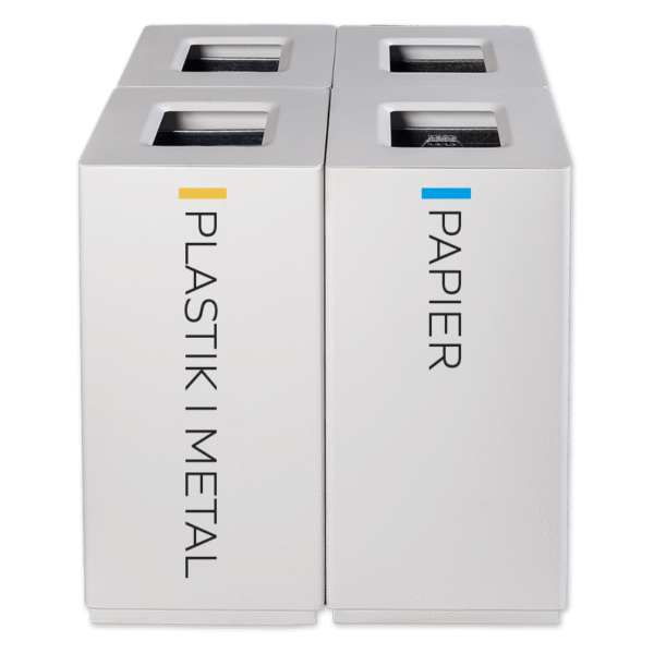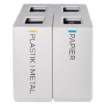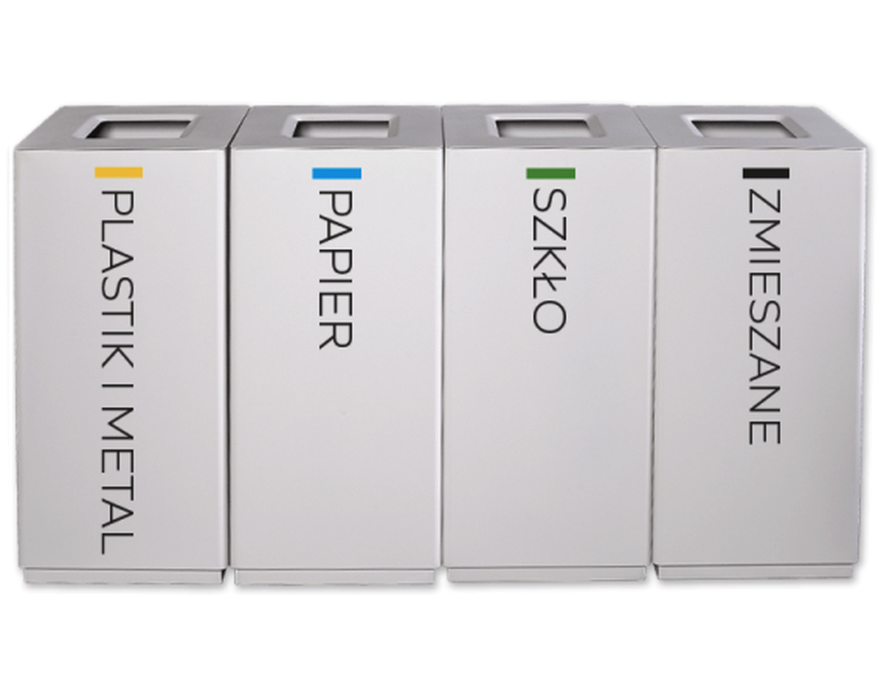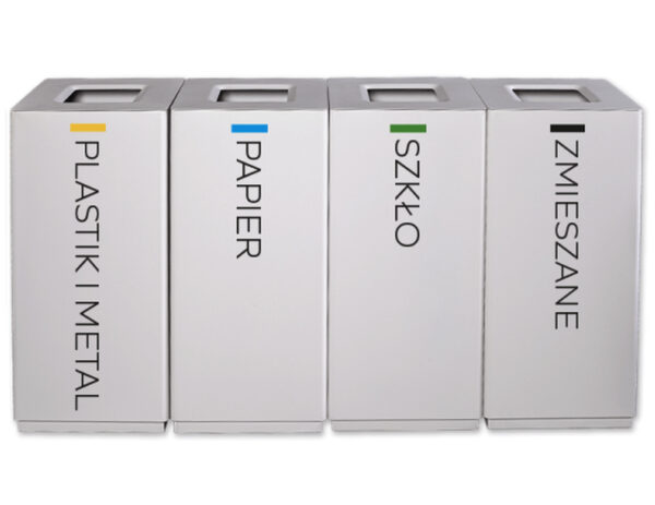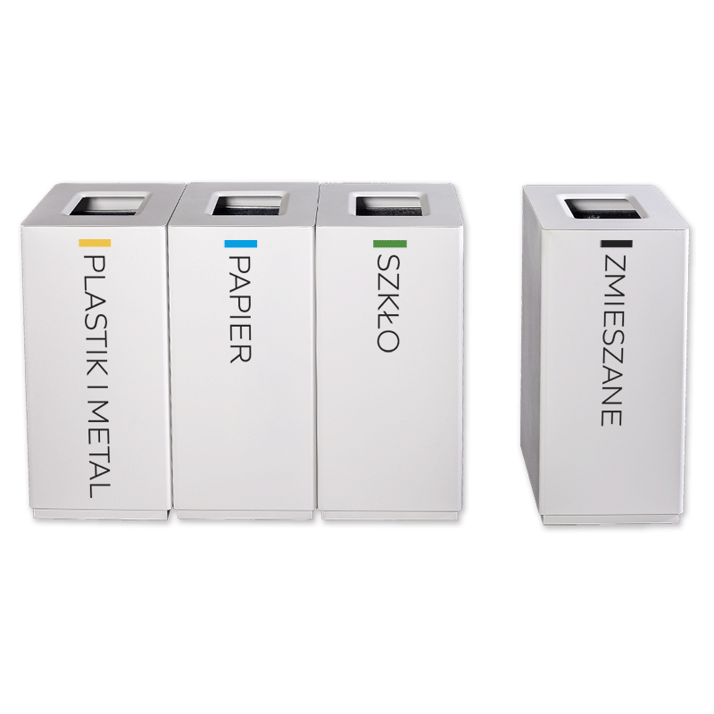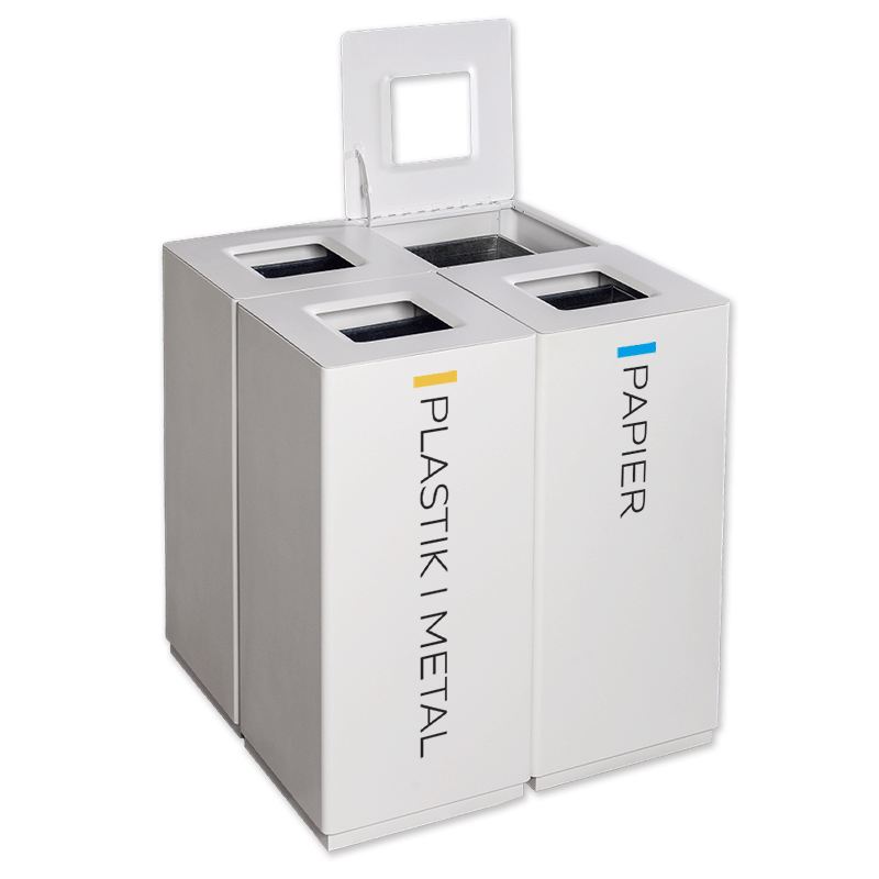 The 4-bin set for segregation has a capacity of 4 × 60 liters and a freestanding design. It is made of galvanized steel with a white powder coating for enhanced corrosion resistance and protection against mechanical damage. The white finish provides a modern, minimalist look that blends well with a variety of surroundings and is easy to clean and maintain.